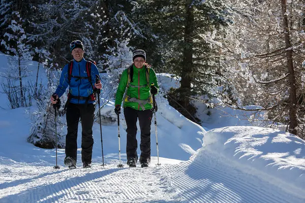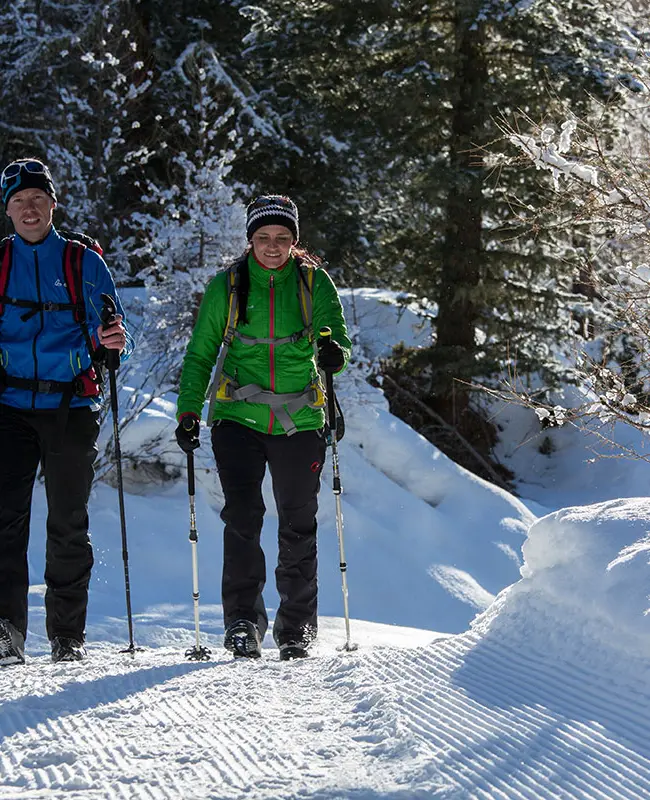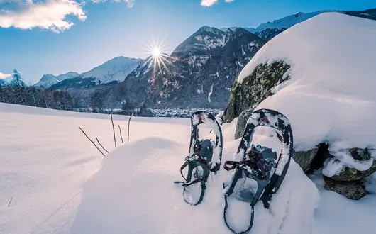 - Hochwertige Schneeschuhe und Stöcke im Gratisverleih